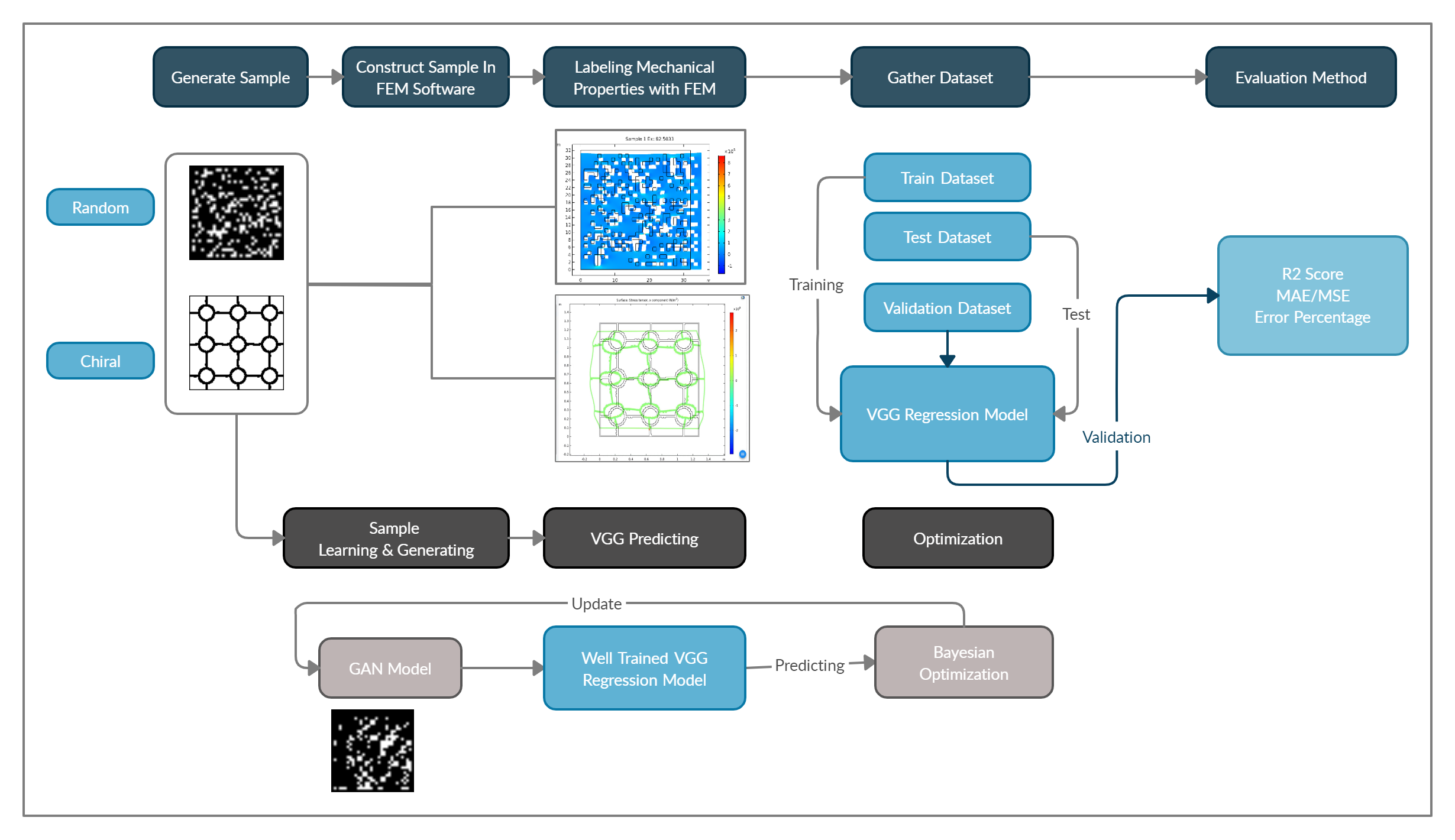 Metamaterials with highly human-influenced microstructure may exhibit unconventional physical properties, such as negative index of refraction (NIR), negative Poisson’s ratio (NPR), negative thermal expansion coefficient (NTEC), or deformation-mode couplings. The couplings between tension/compression and torsion or bending are intrinsically due to the intertwined internal degrees of freedom at each material point. Traditionally, the design of metamaterials relies on human experiences, such as the Edisonian methodology, based on the concept of trial and error. By using deep convolution neural networks, such as VGG, we have developed a methodology to create metamaterials with desired chiral microstructures, as shown in the flowchart below. Data consisting of microstructural image information and effective mechanical properties are prepared via finite element calculations. Generation of initial chiral samples for DNN training is based on a Markov chain process. Our DNN can be successfully trained to correlate the chiral microstructures and their effective mechanical properties. Creating samples via generative adversarial networks (GAN) or other strategies is discussed.